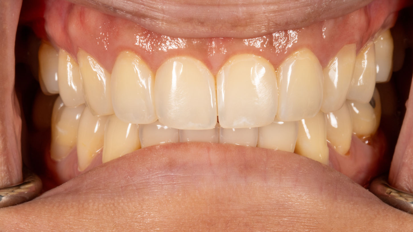 Black triangles between teeth can make a smile appear less full and more uneven. This case uses a minimally invasive Bioclear technique to close black triangles, improve emergence profile, and create a more continuous smile line.